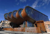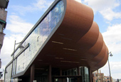 Con nueve plantas y una superficie de 17.214 m², el edificio se vislumbra de forma ascendente y exenta como una escultura que cobija las zonas peatonales de la estancia y que, gracias a su fachada de lamas de colores, se conforma como un foco de atención y referencia, ya sea de día, por la filtración de la luz natural difusa, o de noche, como lámpara de luz artificial al exterior.